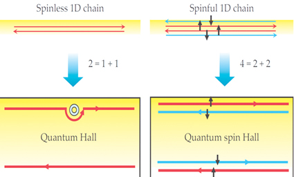 所以在一维空间里,电子有四种不同的运动方式,可以自旋向上,可以自旋向下,也可以向前或向后。我们的工作把这四种运动方式在空间中拆分为2+2。在某种程度上,自旋向上的电子是顺时针运动,自旋向下的电子是逆时针运动。我们利用这个原理,在2006年进行了理论上的研究。
