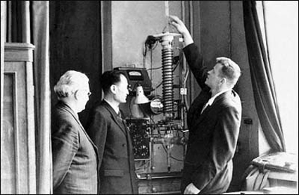 图为一九五六年三月访苏期间,葛庭燧(中)在莫斯科钢铁学院参观芬克尔斯坦实验室的葛氏扭摆内耗仪装置。